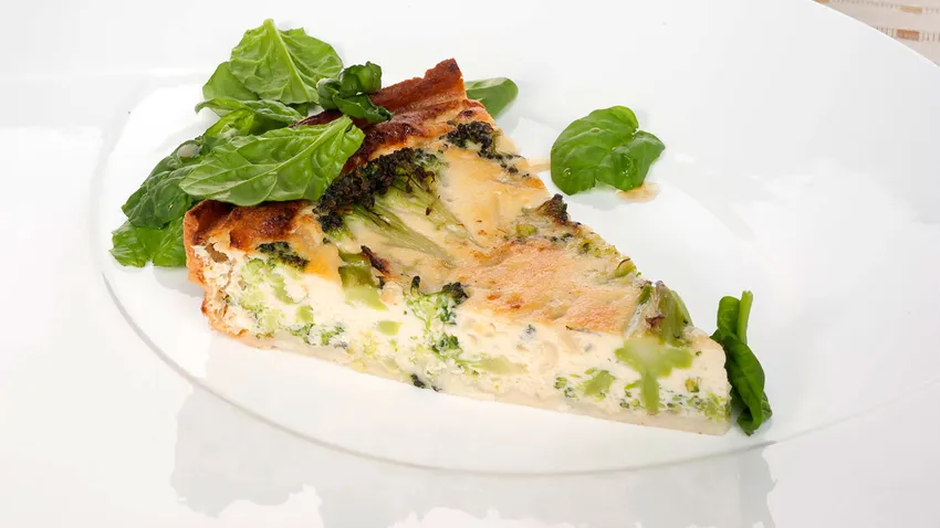 Receta de Bruno Oteiza de tarta de brócoli y queso azul acompañado de ensalada de espinacas, una deliciosa tarta salada con base de pasta brisa similar a una quiche.