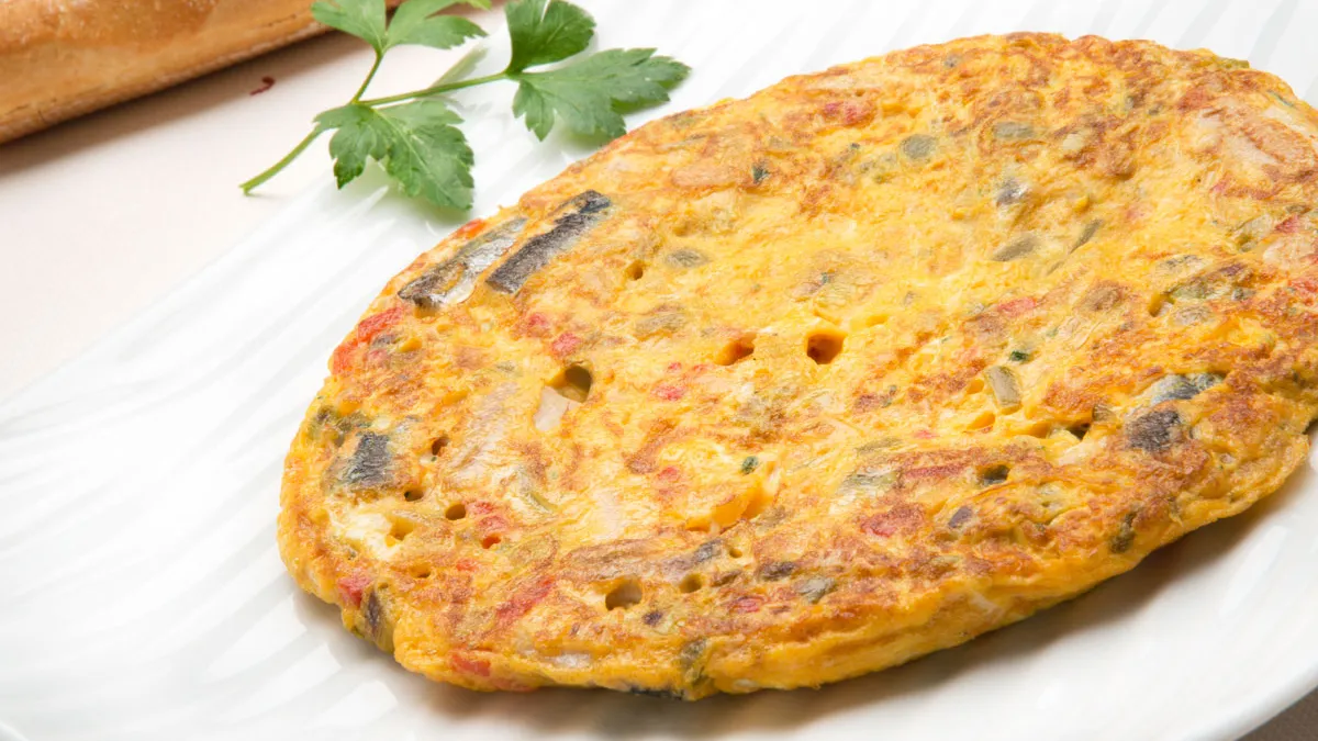 Receta de Karlos Arguiñano de tortilla de anchoas y verduras acompañada de ensalada de aguacate y tomate.