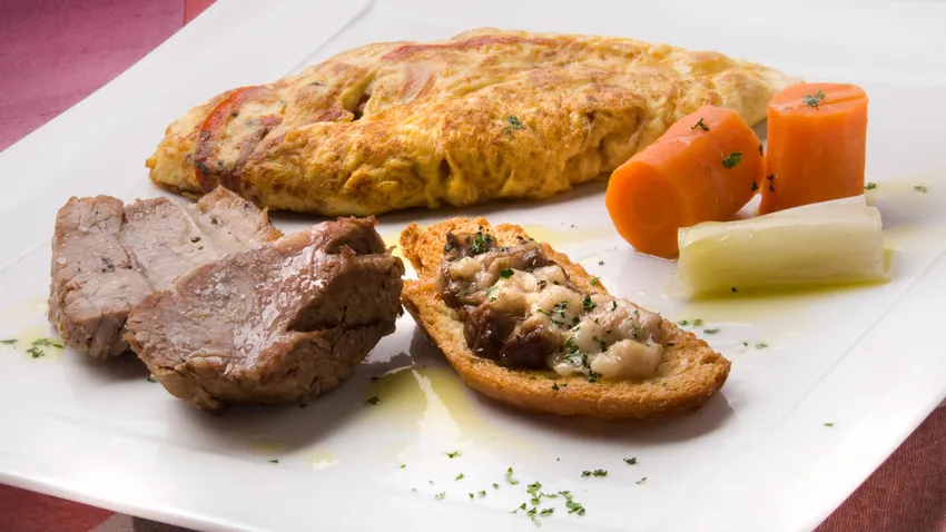 Receta de tortilla de garbanzos a base de huevos, garbanzos cocidos y carne de ternera.