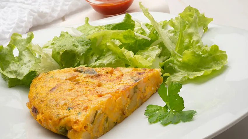 Elaboración de la receta Tortilla de patatas con tomate picante y ensalada: