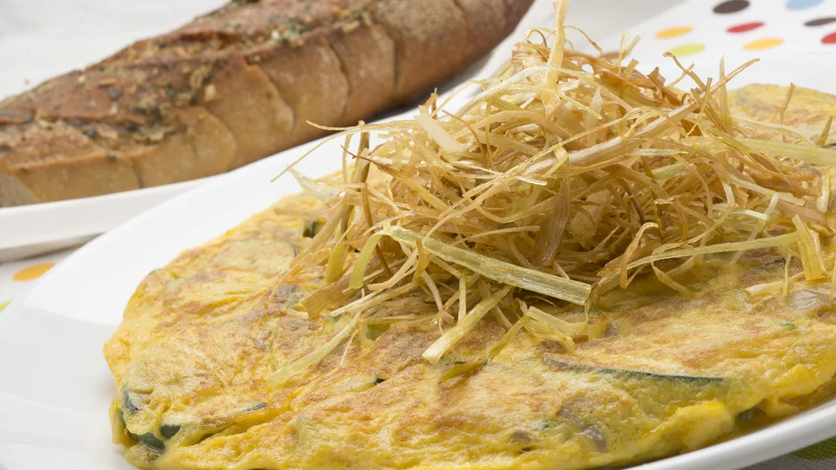 Karlos Arguiñano elabora una receta de tortilla de setas, calabacín y tocineta acompañada de pan de ajo y tiras de puerro frito.