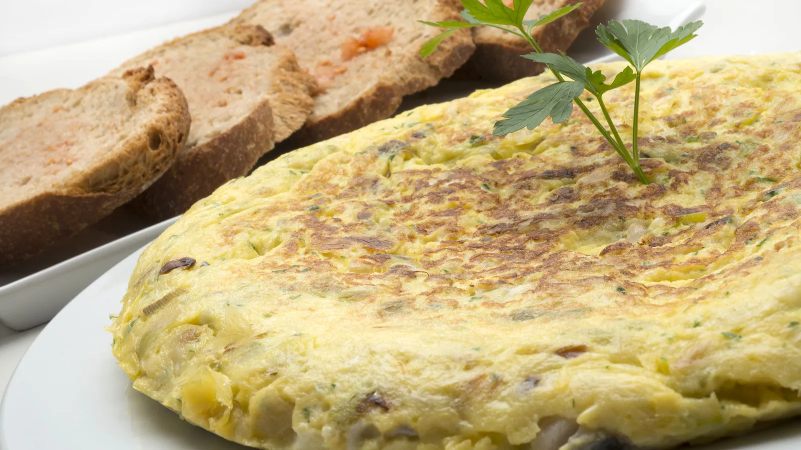 Karlos Arguiñano presenta una receta de tortilla de verdel, puerro y cebolleta acompañada de pan tostado untado con ajo y tomate.