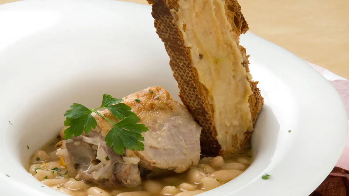 Karlos Arguiñano elabora una receta de alubias blancas con cuello de cordero cocinado en la olla rápida. Y para acompañar, prepara unas rebanadas de pan tostado con crema de ajo.