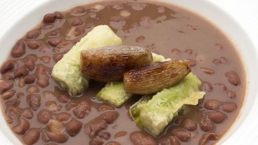 Karlos Arguiñano elabora un plato de alubias negras cocinadas en la olla rápida acompañadas de chalotas y puerros en tempura.