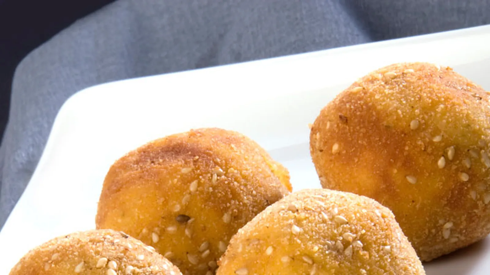 Bate el huevo y mezcla el sésamo con el pan rallado. Haz bolitas con la masa y pásalas por harina, huevo y el pan rallado con sésamo. Fríelas en una sartén con abundante aceite. Escurre sobre papel absorbente. Sirve 4 croquetas por ración y decora el plato con una hojita de perejil.