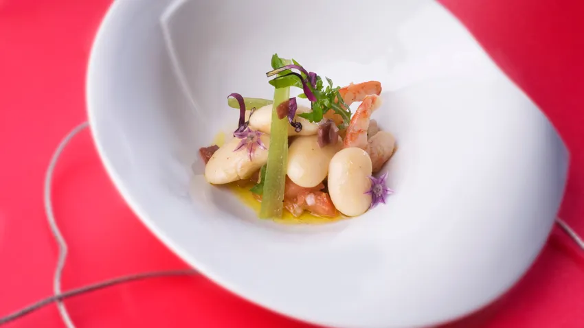 Pon el macerado de verduras en el plato y coloca encima los judiones templados con las gambas y el jamón. Añade los tallos de borraja y vierte por encima el aceite de flores. Decora con unas flores de cebollino.