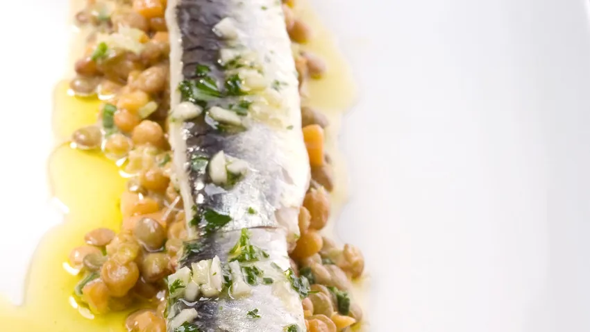 Ensalada de lentejas con anchoas marinadas