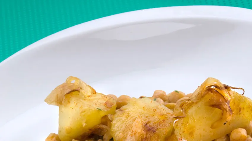 Garbanzos fritos con huevo escalfado