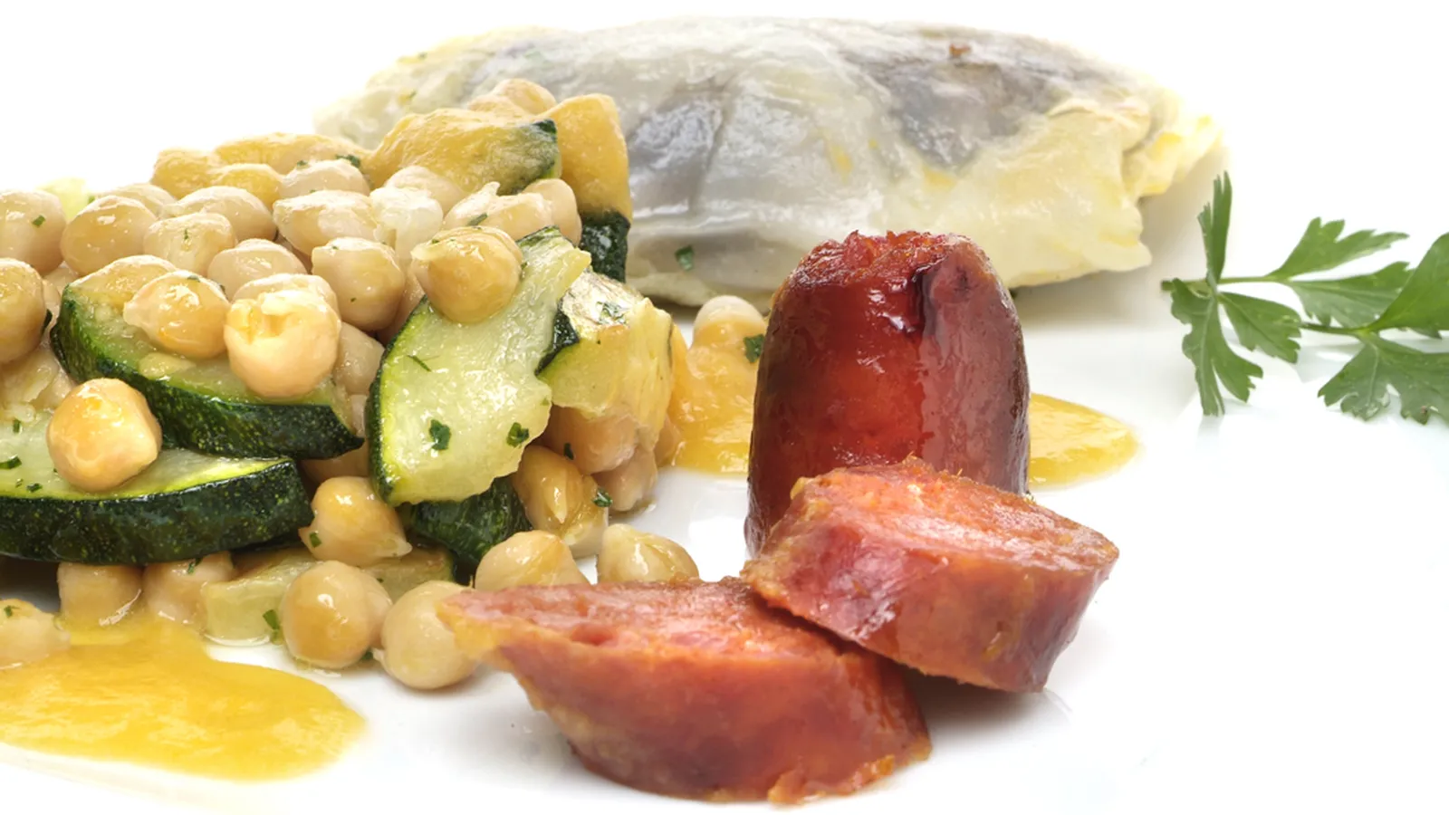 Corta el calabacín en medias lunas, sazona, saltéalos en una sartén con aceite y añade los garbanzos. Espolvorea perejil picado.