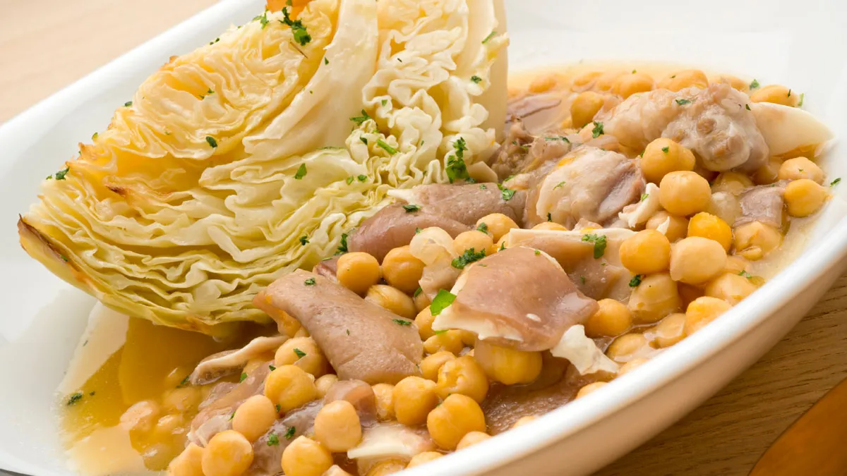 Receta de Karlos Arguiñano de guiso de garbanzos con oreja y berza asada, un plato rico y consistente ideal para los días de frío.