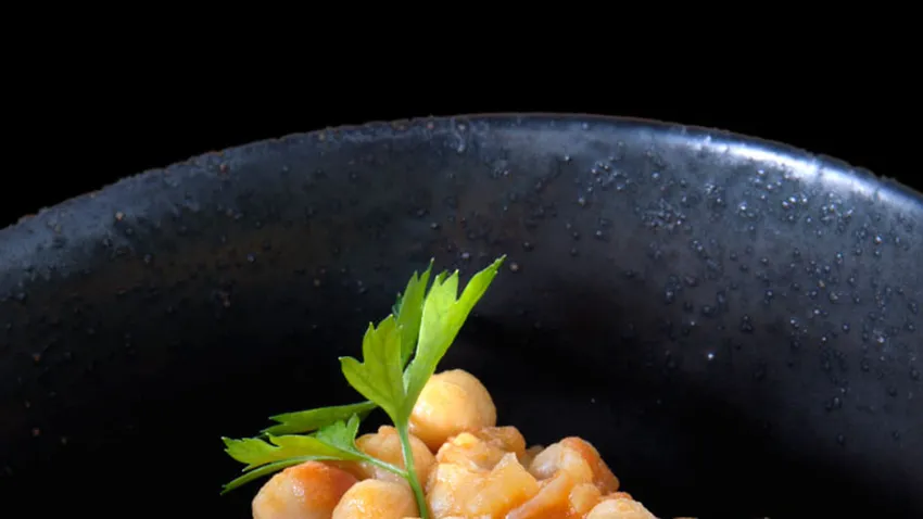 Receta de garbanzos con refrito de jamón y tomate, un plato de legumbre elaborado con salsa de tomate, jamón serrano en dados dorados. Receta Karlos Arguiñano.