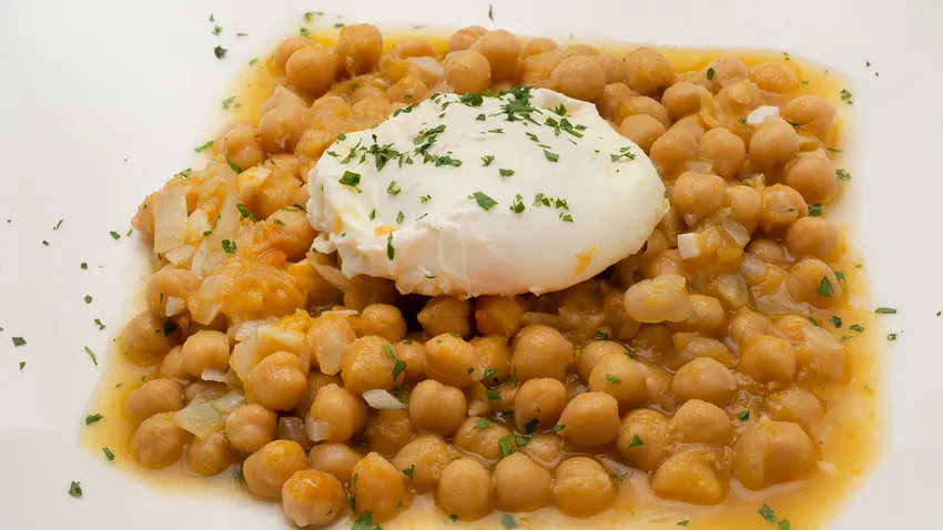 Garbanzos en salsa con huevo escalfado