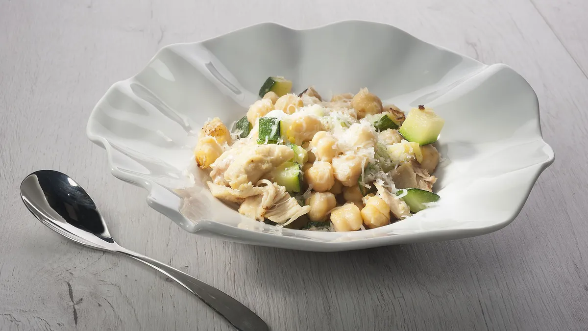 Receta de garbanzos salteados con calabacín, pollo y ajo con queso rallado, un plato elaborado por la cocinera Amaia Urdangarin para los niños.