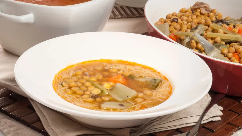 Bruno Oteiza prepara un plato de garbanzos con verduras y aprovecha el caldo para elaborar una sopa de fideos.