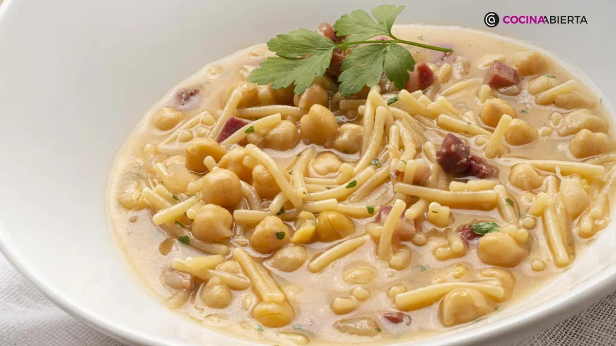 Elaboramos un un plato de invierno muy sencillo: Guiso de garbanzos, fideos y jamón, una reconfortante receta de legumbres con la que además de disfrutar, nos ayudará a combatir las bajas temperaturas.