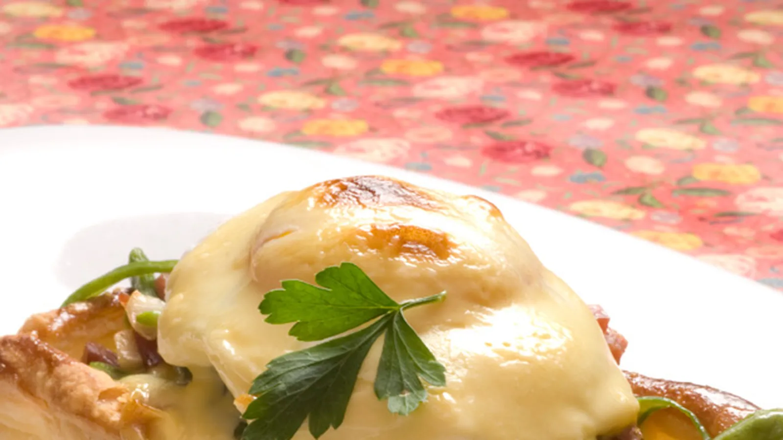 Receta de hojaldres rellenos de judías verdes y huevos escalfados gratinados con lactonesa, mayonesa con leche.