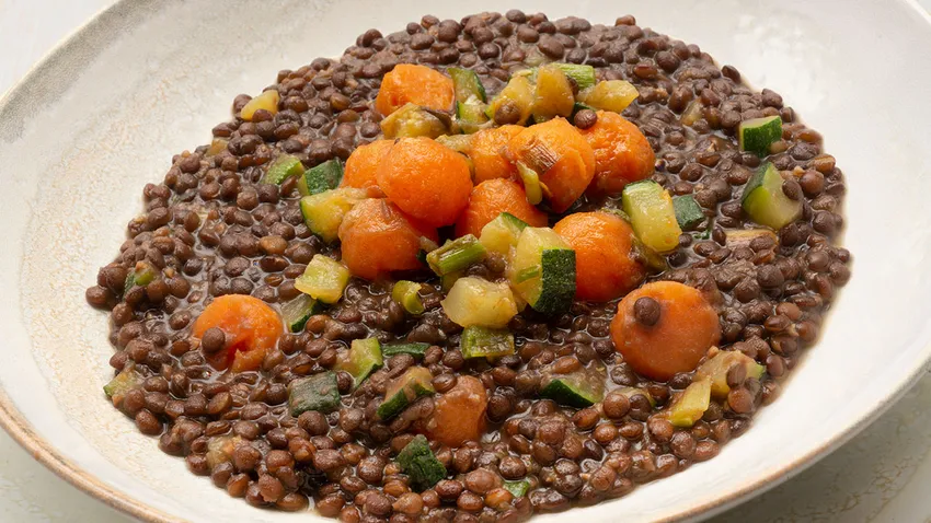 Karlos Arguiñano elabora la deliciosa receta de cuchara y vegana: Lentejas con calabacín y bolitas de boniato en su programa de televisión Cocina Abierta ¡para combatir el frío!