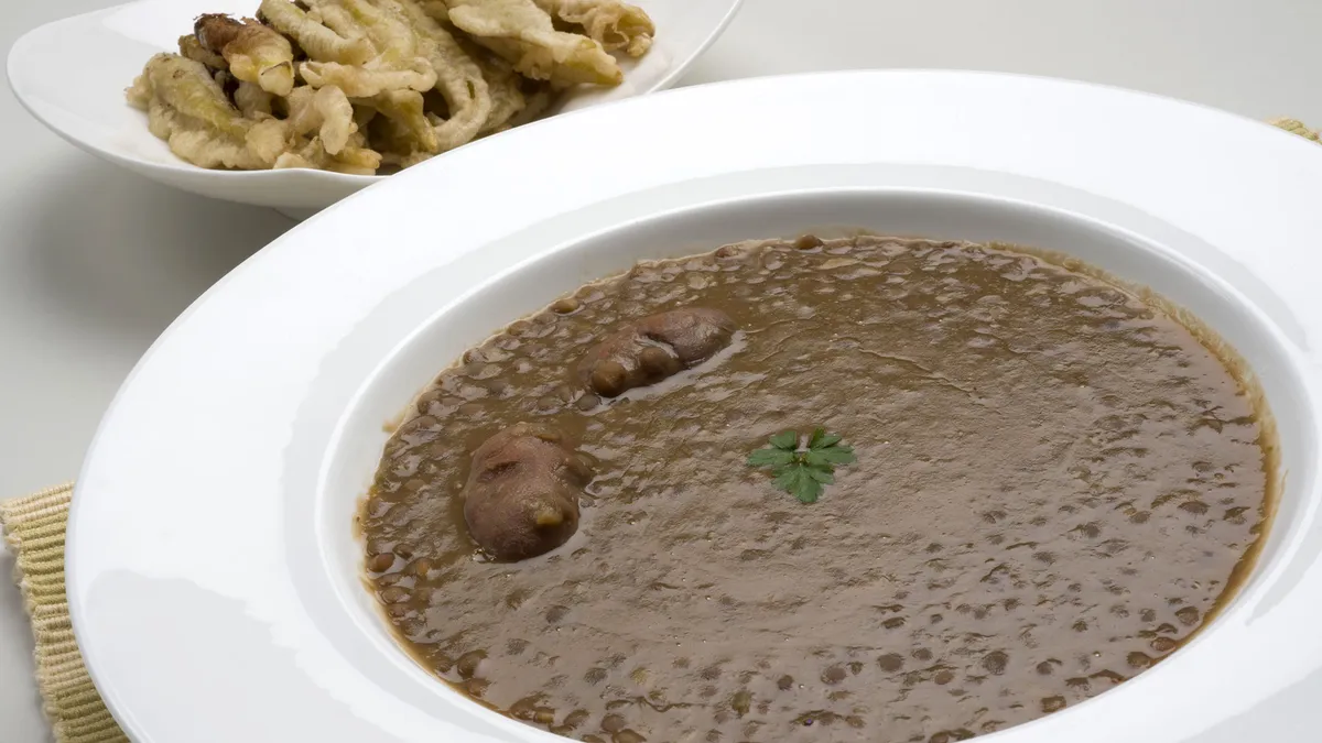 Lentejas con chorijuelos y guindillas en tempura