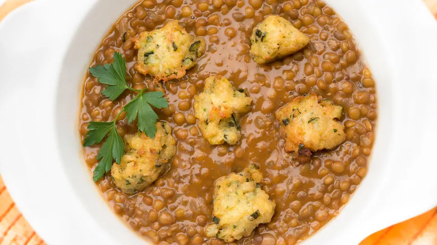 Receta de Karlos Arguiñano de lentejas cocinadas en la olla express u olla rápida acompañadas de fritos de calabacín.
