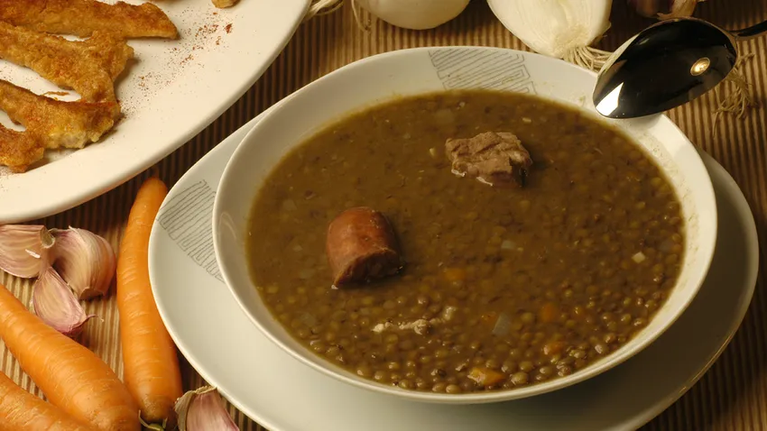 Deliciosa receta de lentejas con oreja de cerdo, Karlos Arguiñano prepara las lentejas con tocino, chorizo y verduras, acompañado de tiras de oreja de cerdo rebozadas.