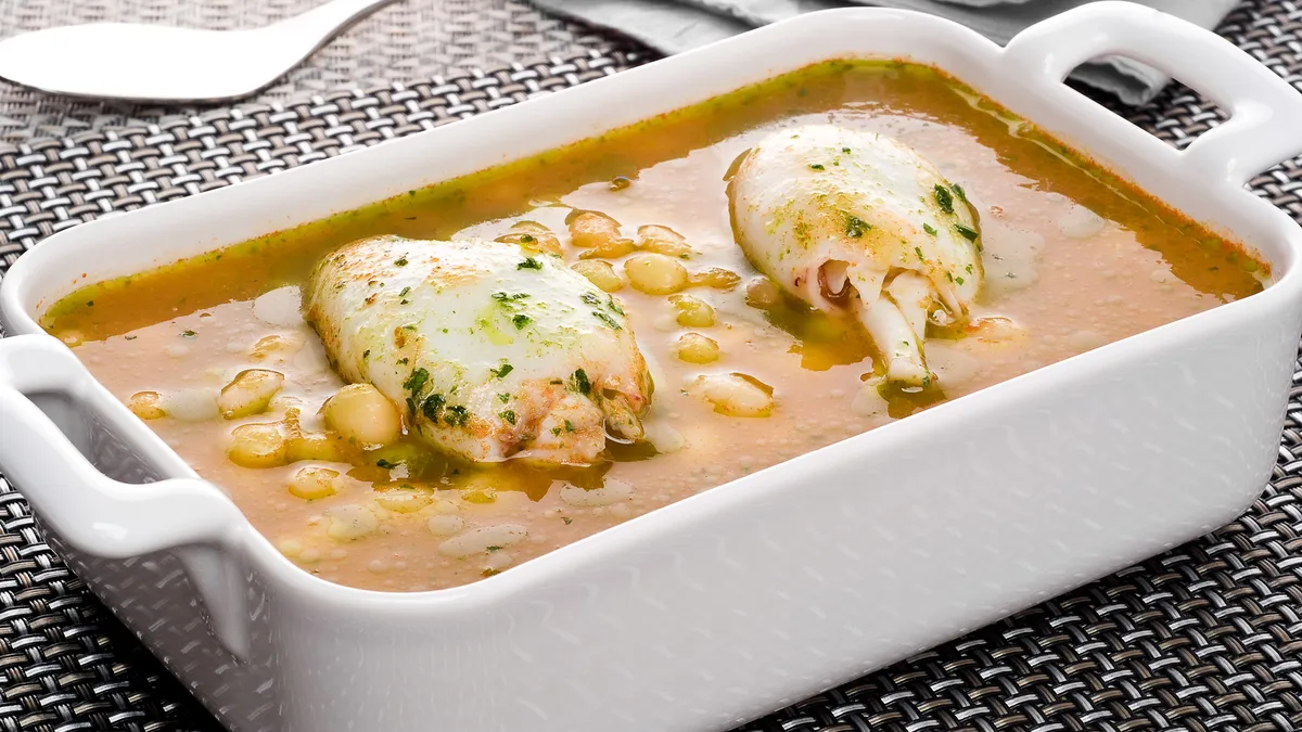Receta de pochas con chipirones. Receta de Bruno Oteiza de alubias (pochas) guisadas en cazuela con chipirones rellenos y pimiento verde.