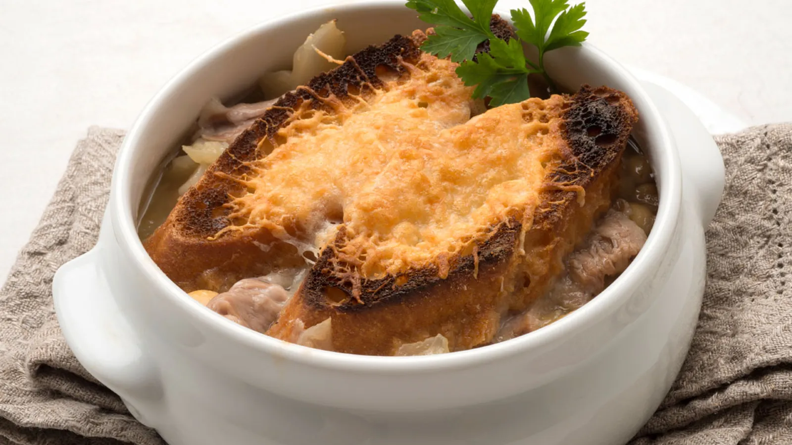 Sirve los garbanzos en 4 cuencos aptos para el horno. Reparte la carne desmigada. Coloca encima 2 trozos de pan y sobre ellos unas láminas de queso. Gratina en el horno.