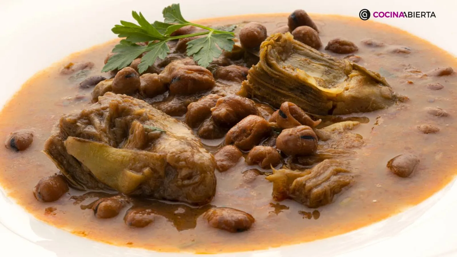 Reparte las habas en 4 platos hondos y decóralos con unas hojas de perejil. ¡Listo! Ya podrás degustar este delicioso y completo potaje de habas secas con alcachofas.