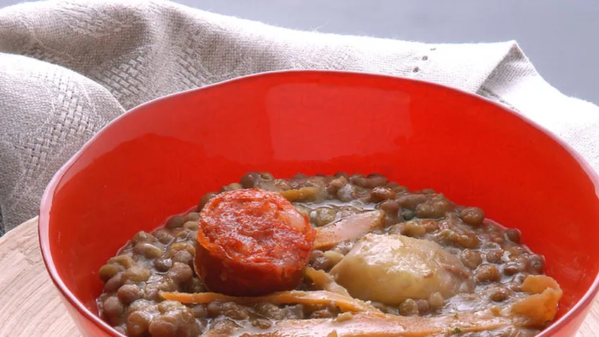 Receta de potaje de lentejas y soja con zanahoria salteada, Karlos Arguiñano prepara un delicioso cocido de legumbres con chorizo, soja verde, patatas y zanahorias.