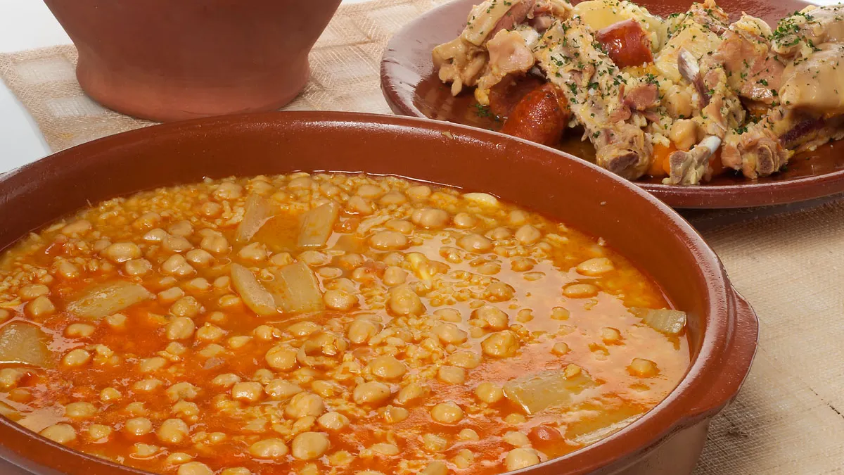 Sirve el puchero de garbanzos en una cazuela de barro y acompaña con la pringá.