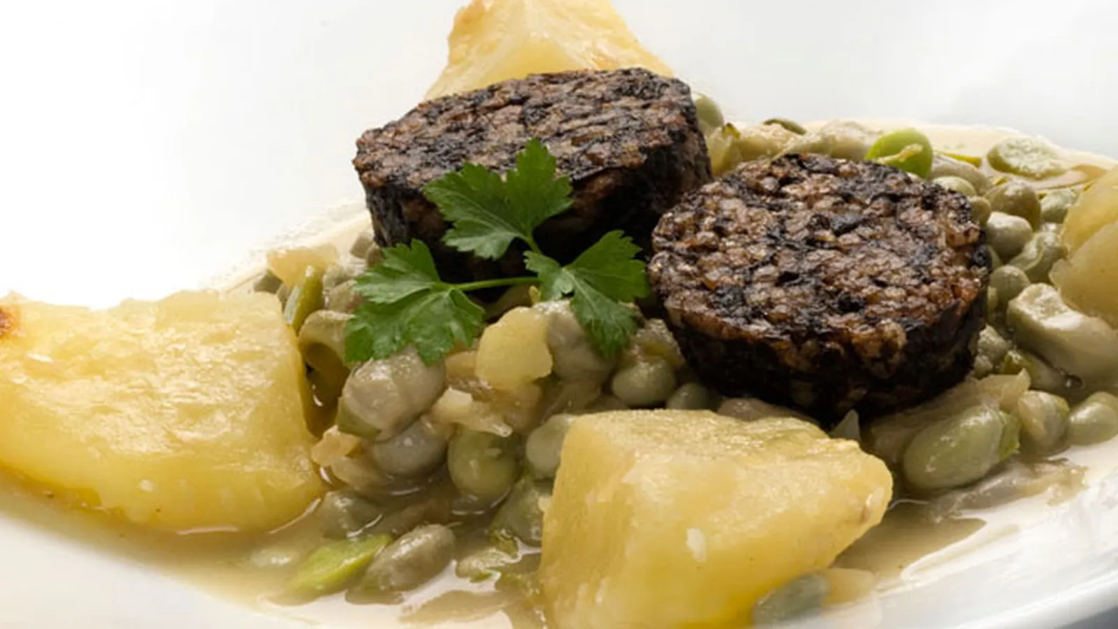 eceta de habas con morcilla, Karlos Arguiñano nos propone degustar unas deliciosas habas con patatas y acompañadas de morcilla de arroz.