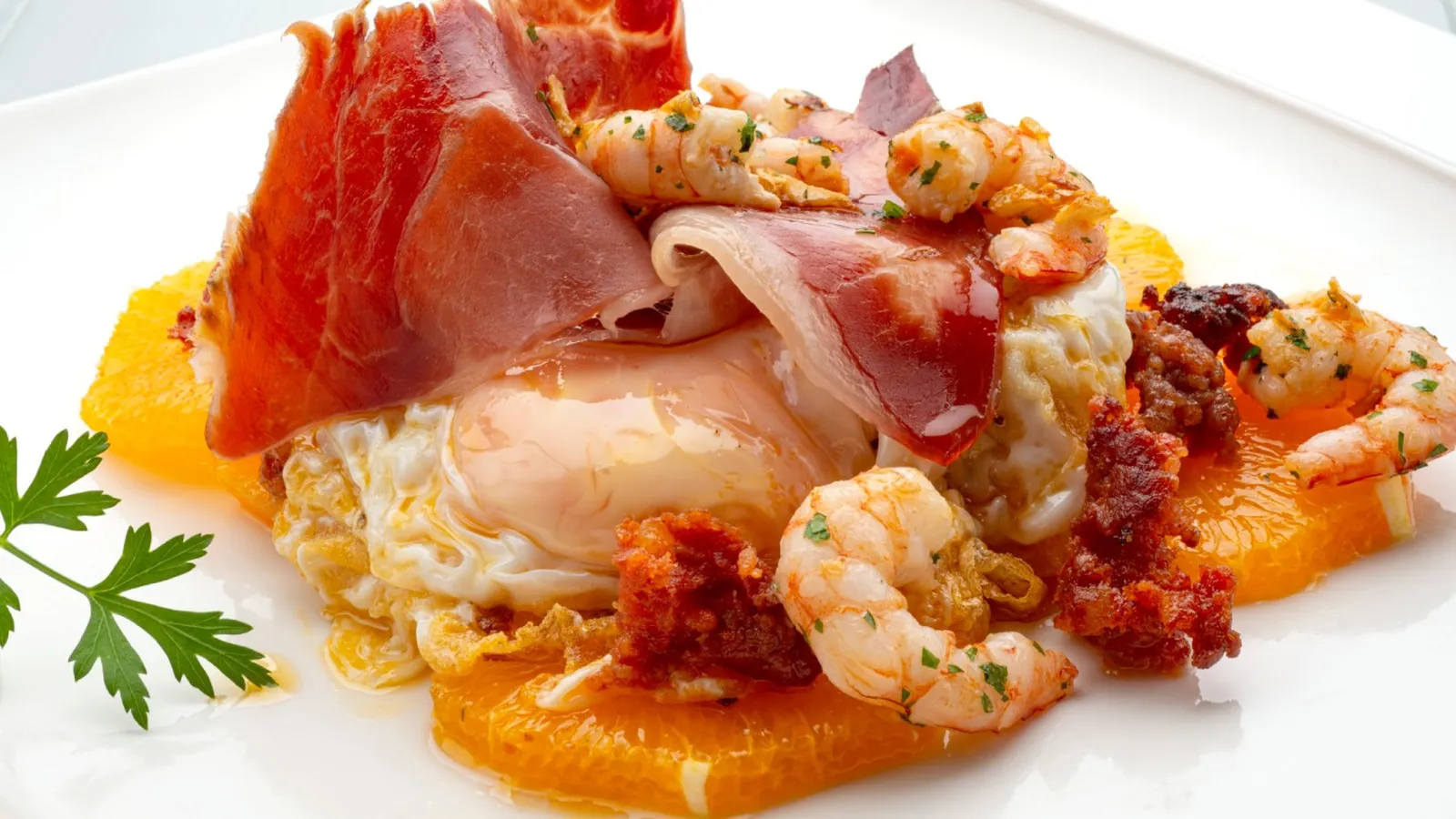 Coloca un huevo en el centro de cada plato, sobre los embutidos y cítricos.Añade una loncha de jamón ibérico sobre cada huevo y reparte 4 gambas en cada plato.