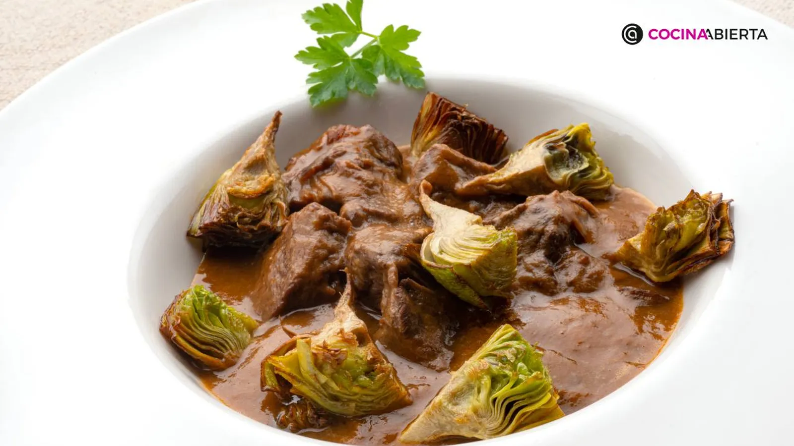Reparte la carne y las alcachofas en 4 platos, y decóralos con unas hojas de perejil.