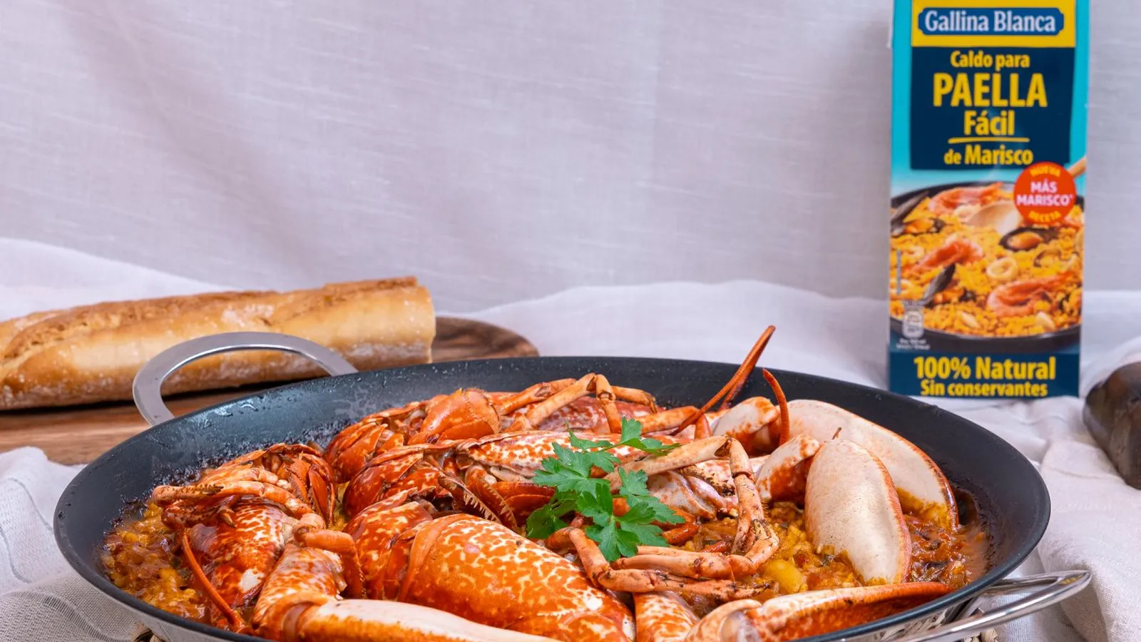 Para elaborar esta paella de bogavante es fundamental utilizar un caldo para paella de calidad, como el Caldo para Paella Fácil de Marisco 100% Natural Gallina Blanca, con marisco y el toque de sofrito que garantiza todo el sabor casero.