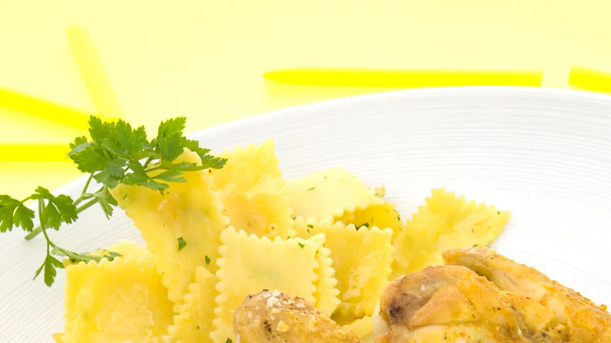 Sirve 4 alitas de pollo por ración, acompaña con la pasta y decora con perejil.