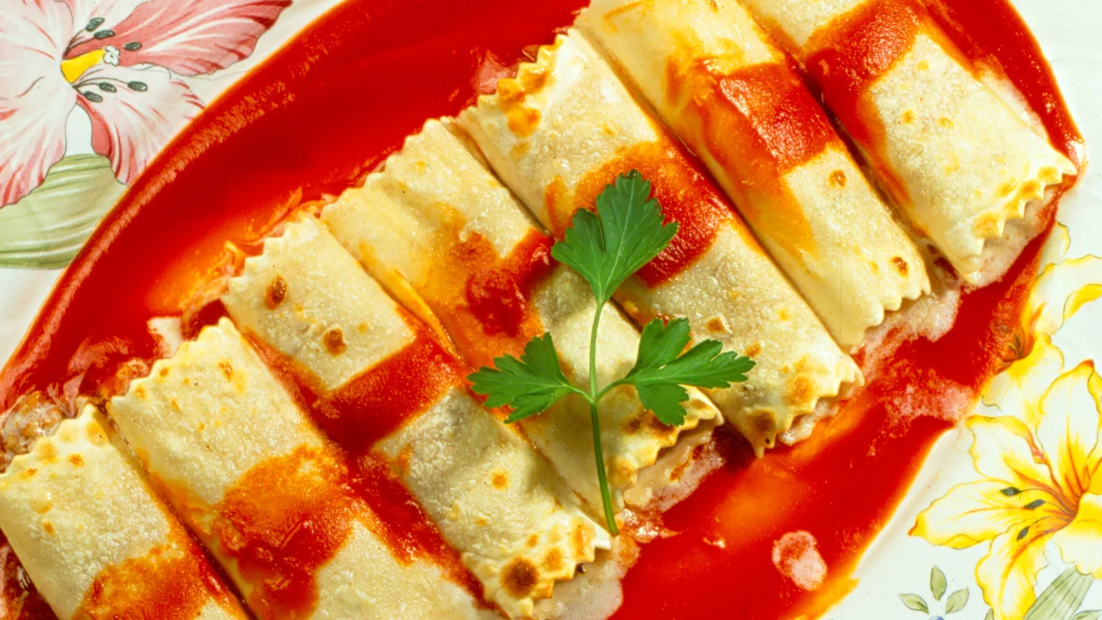 Cubre el fondo de una fuente con salsa de tomate y coloca encima con cuidado los canelones. Sirve.