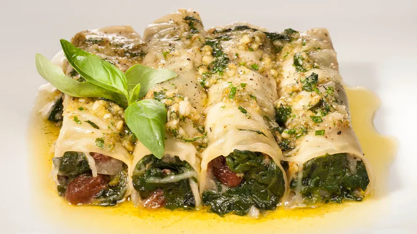 Canelones de espinacas con bacalao al pesto