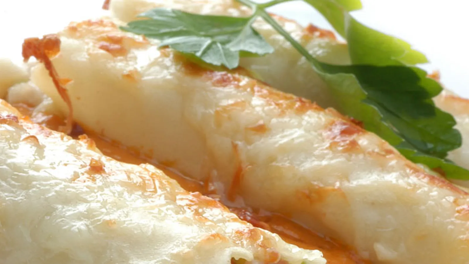 Cubre el fondo de una fuente con la salsa de pimiento, coloca encima los canelones gratinados y decora con una ramita de perejil.