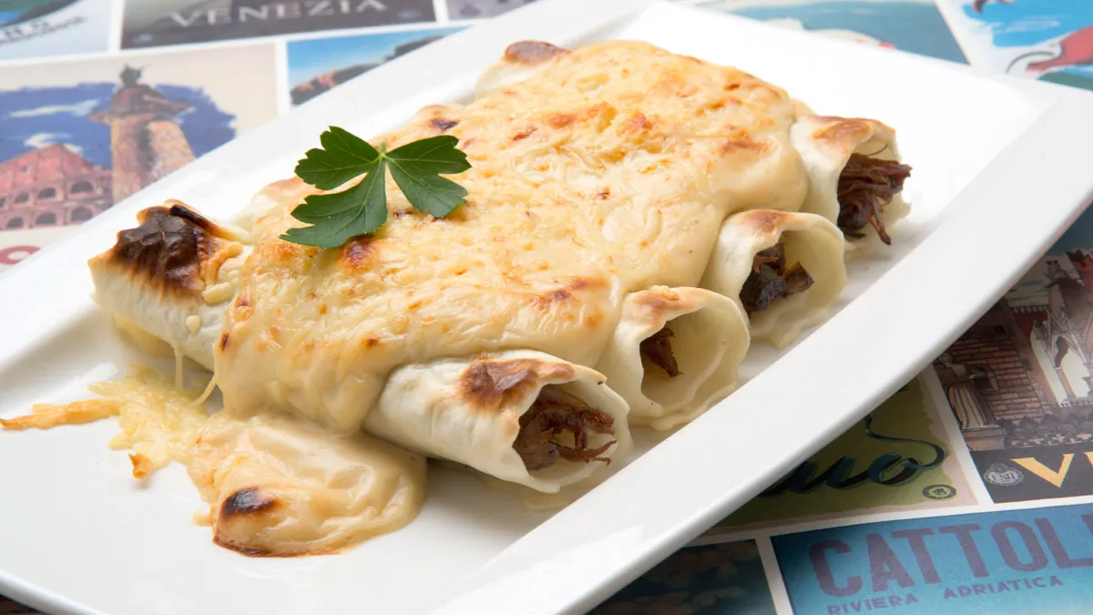 Receta de Karlos Arguiñano de canelones de rabo al vino tinto cocinado en la olla rápida, acompañado de bechamel y queso gratinado.