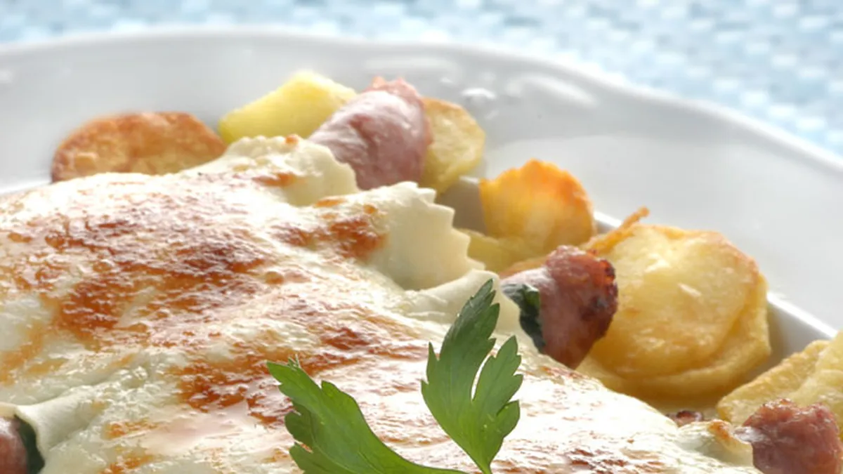 Receta de canelones rellenos de salchichas, patatas y espinacas. Receta elaborada por Karlos Arguiñano.