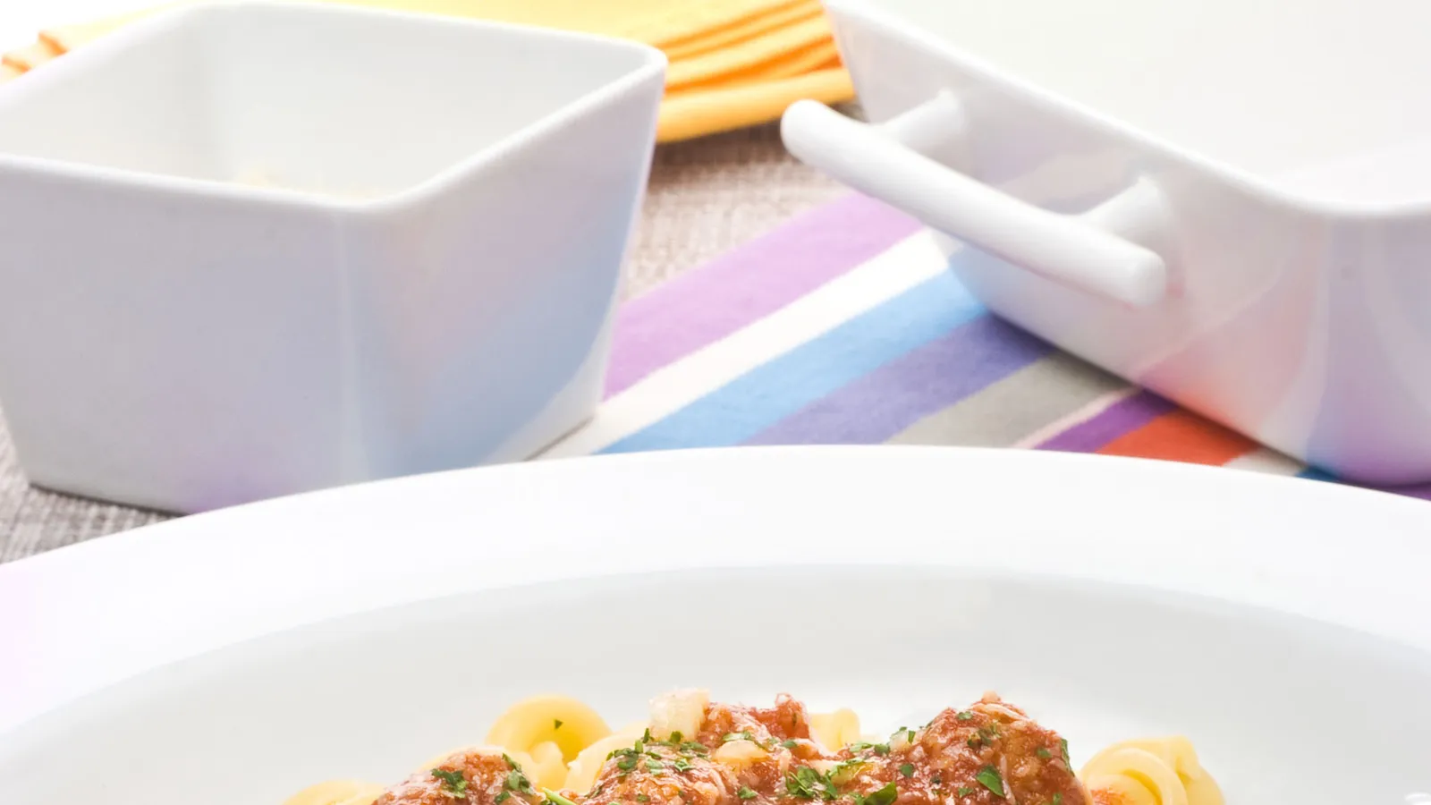 Escurre la pasta y emplátala junto con las albóndigas y la salsa de tomate. Espolvorea con parmesano rallado y con perejil picado y a comer.