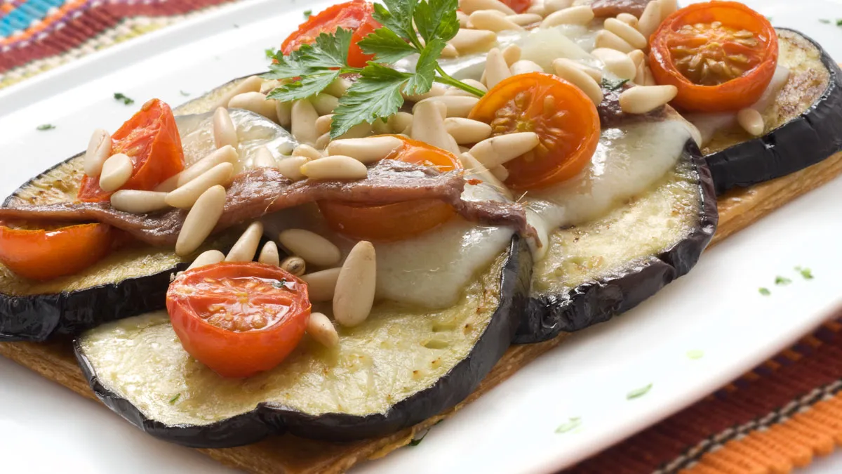 Pela y pica los dientes de ajo y colócalos en el mortero. Añade las hojas de albahaca picaditas y maja. Vierte un chorrito de aceite y sigue majando. Unta los hojaldres con el majado, reparte sobre ellos las lonchas de berenjena y coloca encima una loncha gruesa de queso. Reparte por encima los tomates cherry, las anchoas y los piñones. Gratina en el horno hasta que se funda el queso. Sirve y decora con una ramita de perejil.