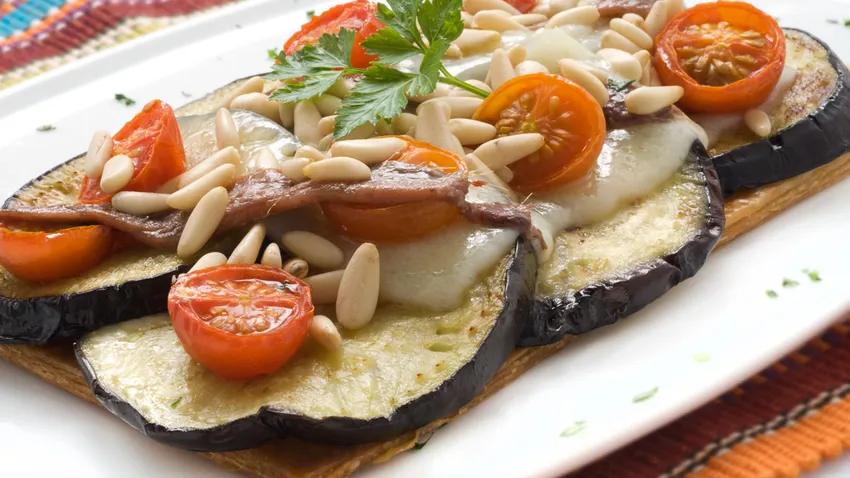 Coca de queso, berenjena y tomate