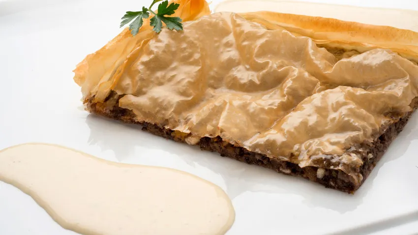 Coloca un papel de hornear sobre la placa del horno. Coge 4 láminas de pasta filo y colócalas una encima de la otra sobre la placa de horno. Extiende el relleno encima (sin llegar a los bordes), cúbrelo con otras 2 láminas de pasta filo y úntalas con aceite. Dobla los bordes hacia el centro y úntalos con un poco más de aceite. Hornea a 200ºC durante 15 minutos. Sirve la empanada y acompáñala con la salsa. Adorna con unas hojas de perejil.