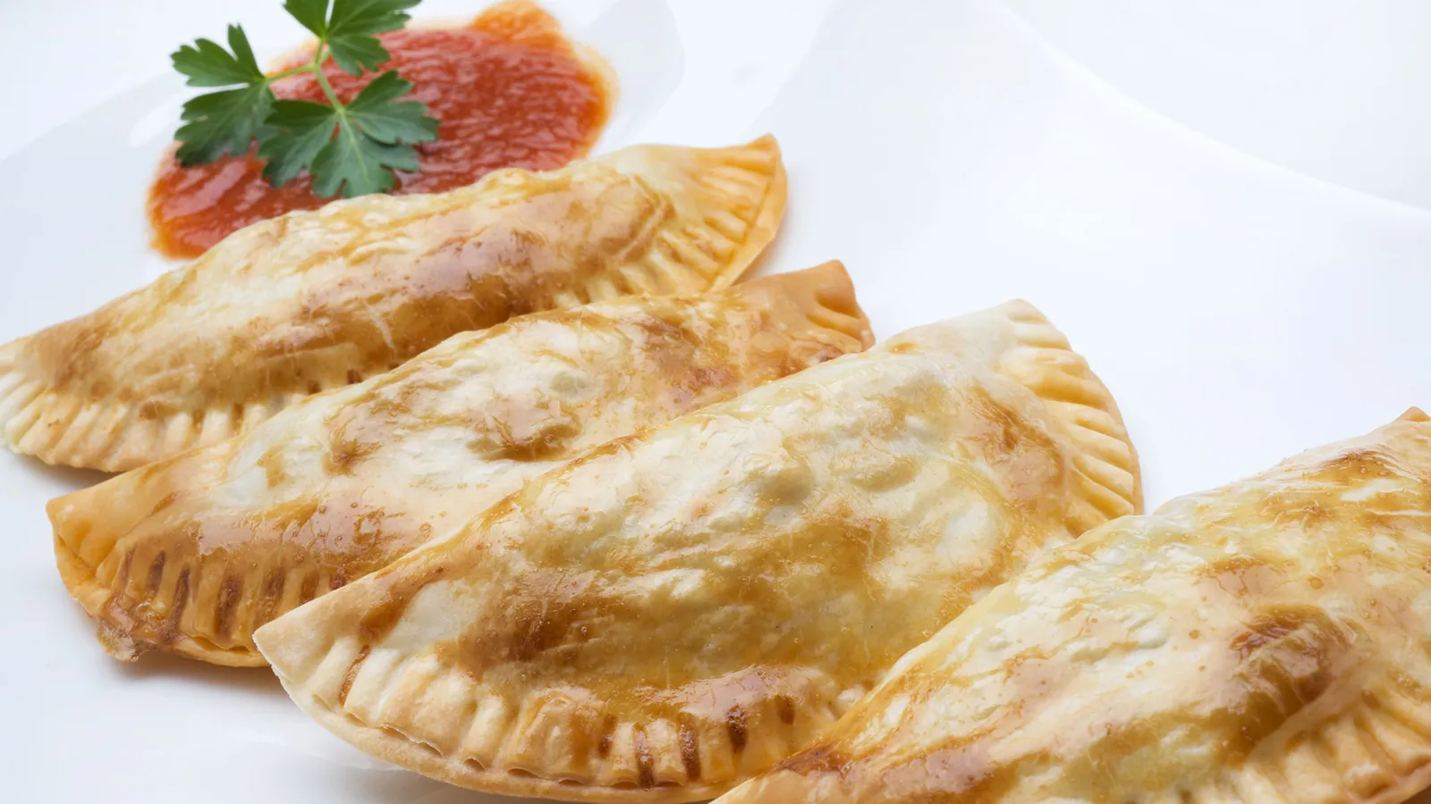 Extiende las empanadillas sobre una superficie lisa y rellénalas. Ciérralas y sella los bordes con ayuda de un tenedor. Colócalas en una bandeja de horno forrada con papel de horno y úntalas con huevo batido.