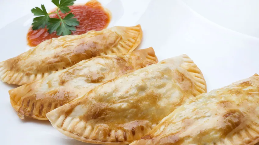 Hornéalas a 200ºC durante 12-15 minutos. Sirve las empanadillas y acompáñalas con el resto de la salsa de tomate caliente. Decora con una hoja de perejil.