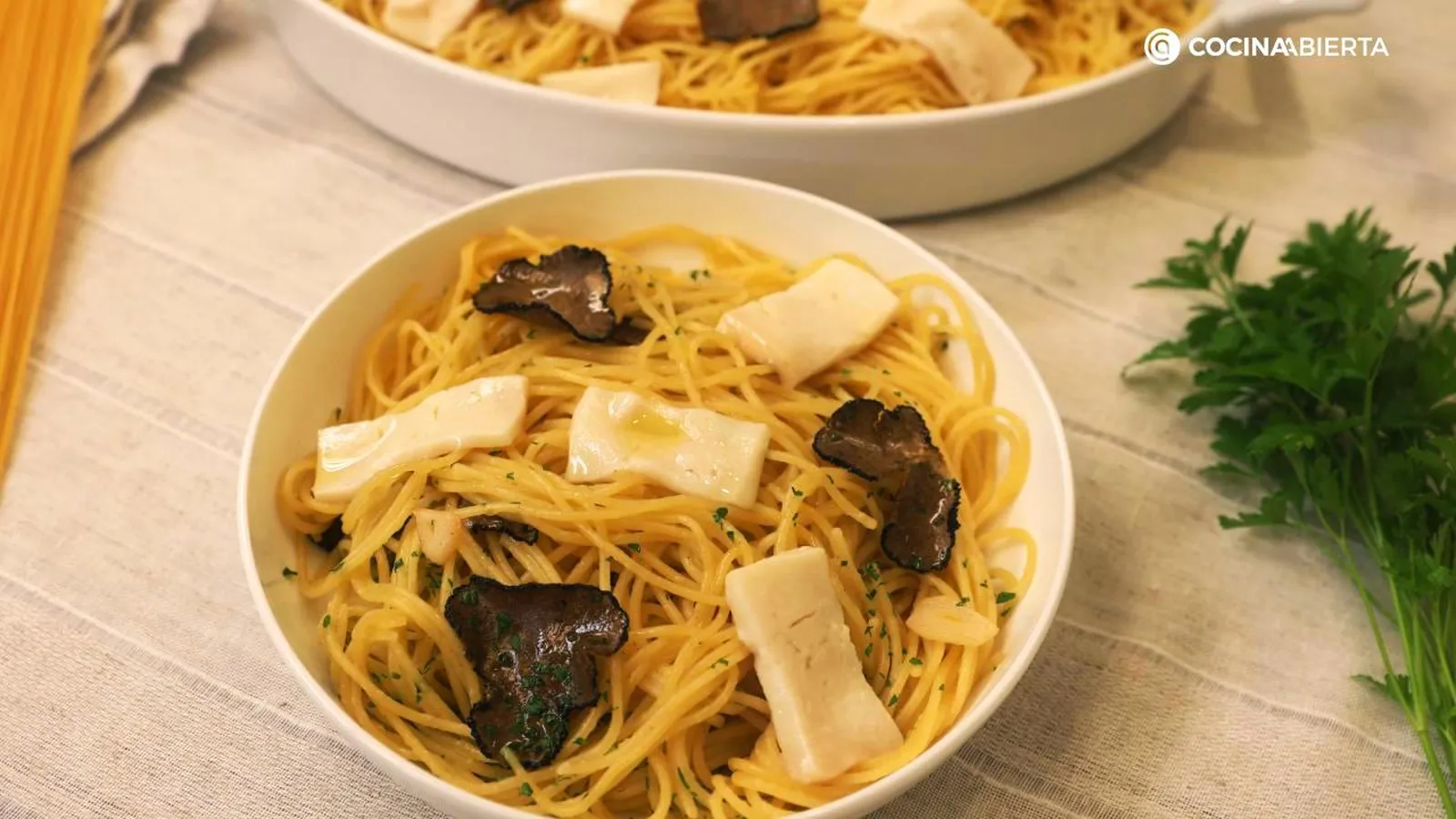 Ya ves que no tiene ninguna complicación y puedes aprovechar el tiempo al máximo. Mientras cueces los espaguetis en agua, puedes ir picando el perejil y cortando los dientes de ajo, la trufa fresca, el queso de cabra.