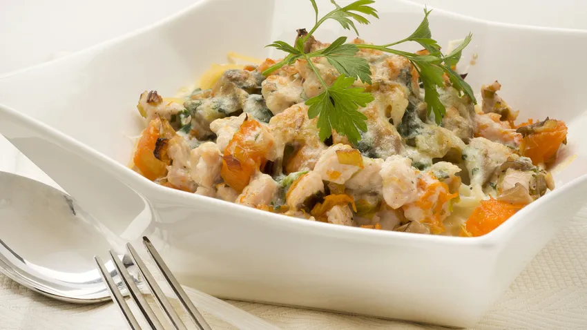 Karlos Arguiñano presenta un plato de espaguetis con pechuga de pavo, setas, calabaza, puerros, ajos frescos, bechamel y queso gratinado.