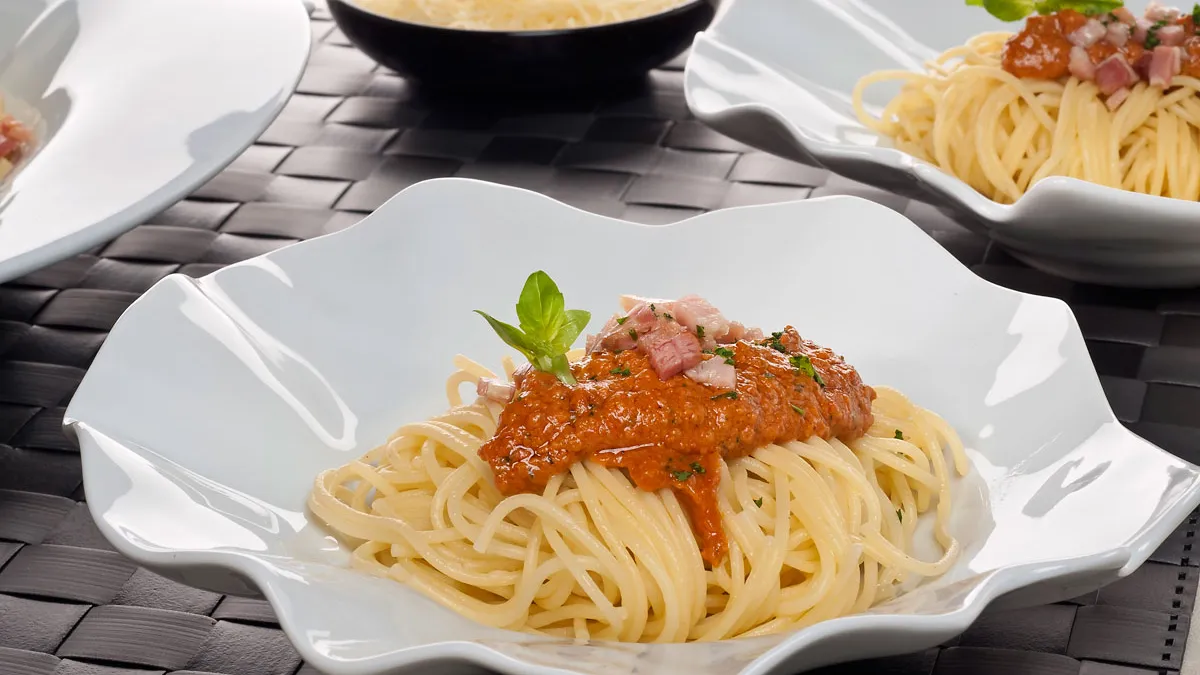 Receta de Bruno Oteiza de espaguetis sicilianos con dados de bacon y pesto rojo, un plato fácil de preparar.
