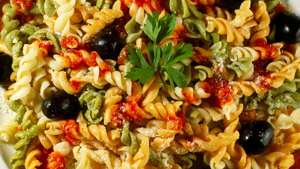 Receta de Karlos Arguiñano de espirales con anchoas, aceitunas negras y salsa de tomate.