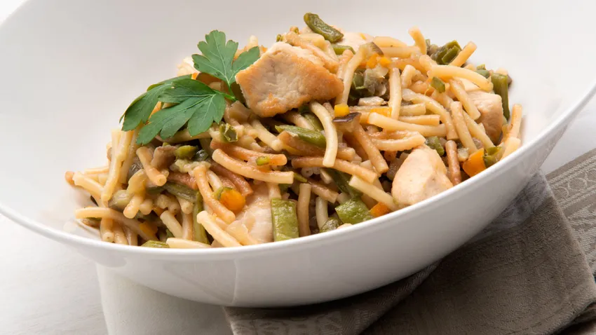 Receta de Karlos Arguiñano de Fideuá de verduras y pavo, un plato muy completo y nutritivo.